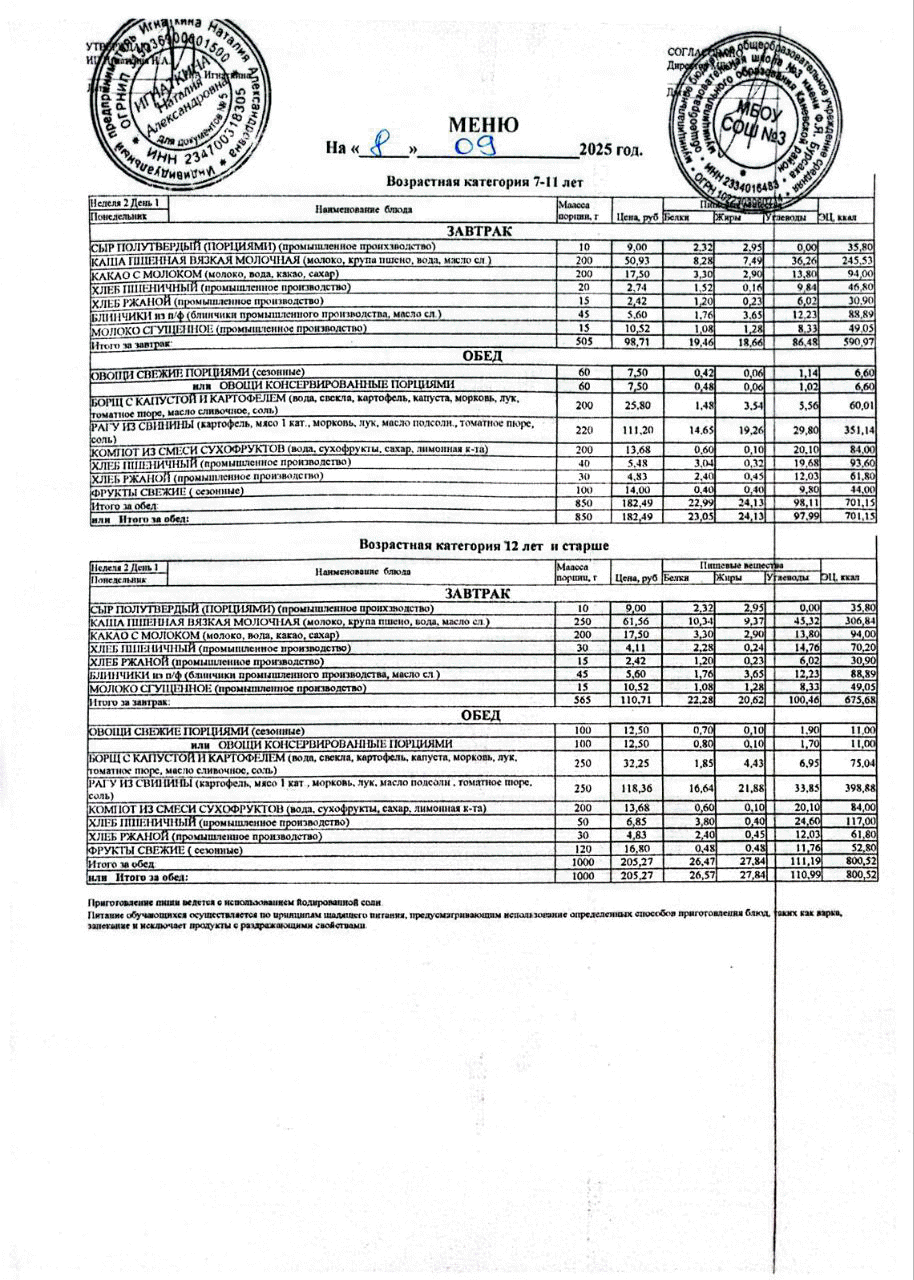 Телефоны “Горячей линии” по вопросам организации бесплатного горячего питания в МБОУ СОШ №3 8(86164)7-13-57 - Приймак Игорь Николаевич, директор МБОУ СОШ №3 8 908 67 82 435 - Сенькаева Анна Сергеевна, ответственный за питание 8 900 24 14 617 - Ситникова Людмила Сергеевна, специалист управления образования Каневской район, 8 (861) 298-25-97 — горячая линия Министерства образования, науки и молодежной политики Краснодарского края — работает ежедневно, кроме субботы и воскресенья и праздничных дней, с 9.00 до 13.00, с 14.00 по 17.00 Родительский контроль за организацией школьного питания <<здесь>> График питания в МБОУ СОШ № 3 в 2025-2026 году Приказ об организации горячего питания обучающихся в 2025-2026 учебном году Приказ о создании бракеражной комиссии Диетическое/лечебное меню:
